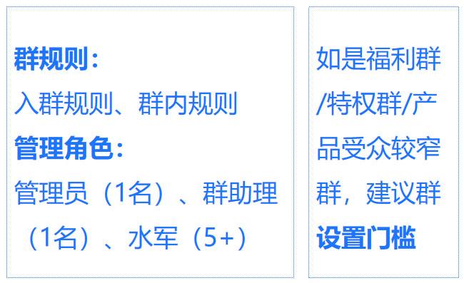 社群建立后需要管理角色,基本的群管理团队包括管理员、群助理及多名水军,同时需要设立好群管理规范,如入群规则和群内规则,通用群规则结构包括群简介和主旨作为基础项,告知用户群的核心主题,其次是对群规则的阐释和鼓励号召,增强群的仪式感和承诺感,最后是感谢语,升华主旨,沉没回馈。