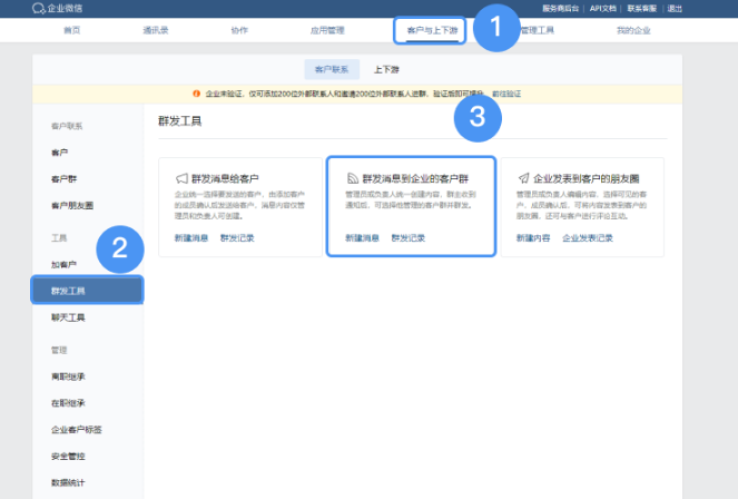 企业微信管理端路径:【管理后台】—【客户与上下游】—【客户联系】—【群发工具】—【群发消息到企业的客户群】。
